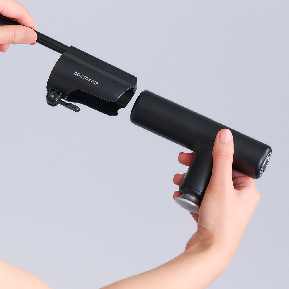 本体をホルダーに差し込み、レバーをロックしてセット完了。取り付けに力も使わず工具は一切不要です。使いたい時にすぐ取り付けられるので、思い立ったタイミングで背中のケアがいつでもでき、セルフケアがもっと身近になります。アームを外して通常のハンディガンとして使うと切り替えもスムーズです。